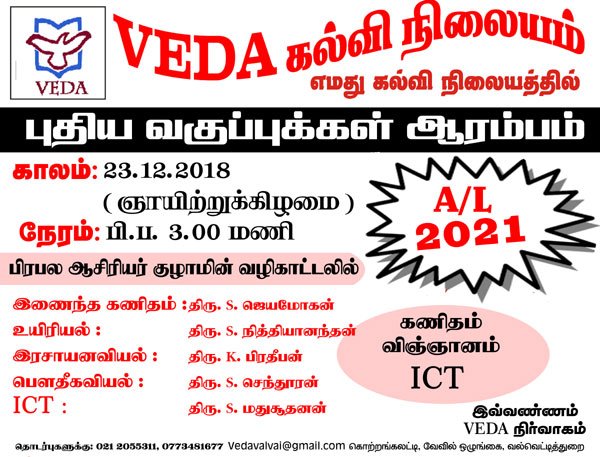 VEDAவில் உயர்தர கணித, விஞ்ஞான புதிய வகுப்புகள் (A/L 2021) ஆரம்பம்