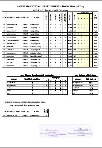 VEDA கல்வி நிலையத்தின் க.பொ.த (உ.த) 2020 பெறுபேறுகள் பிரசுரிக்கப்பட்ட திகதி: 15/08/2021 (ஞாயிற்றுக்கிழமை) VEDA கல்வி நிலையத்தின் க.பொ.த (உ.த) 2020 பெறுபேறுகள்