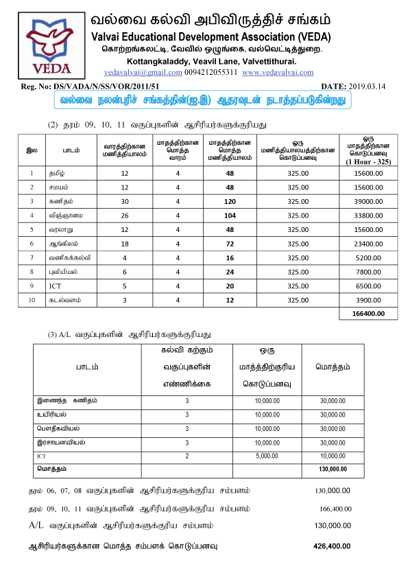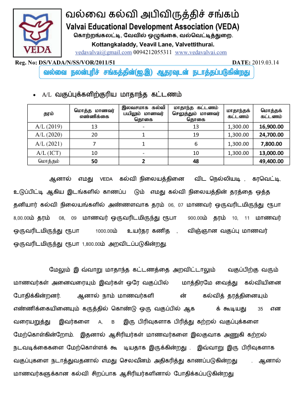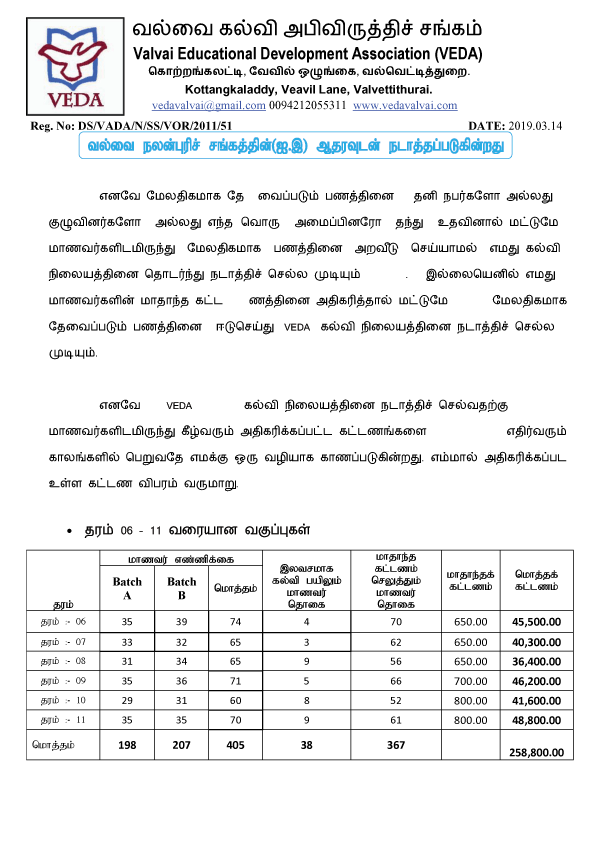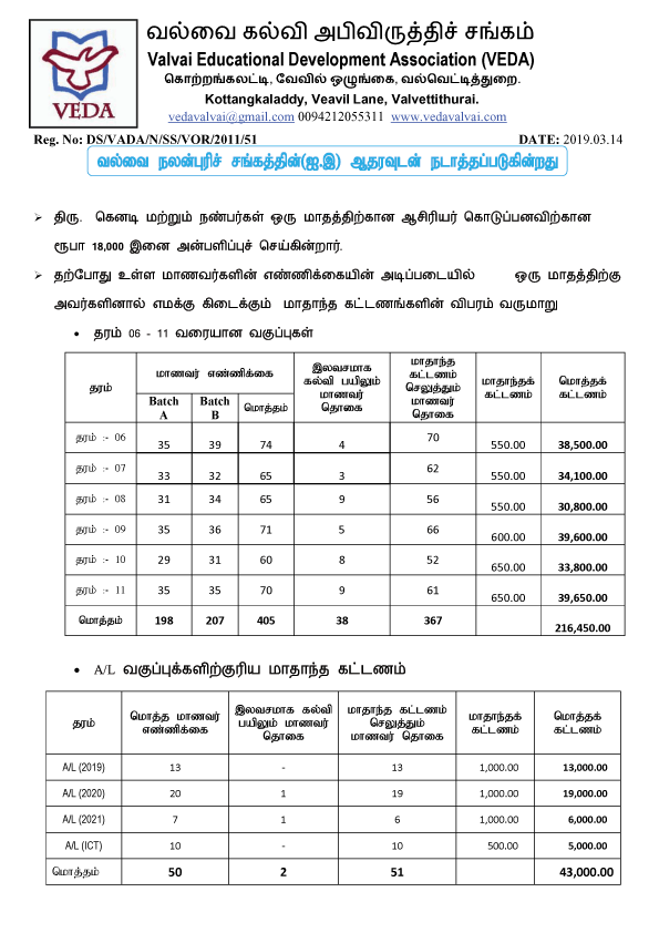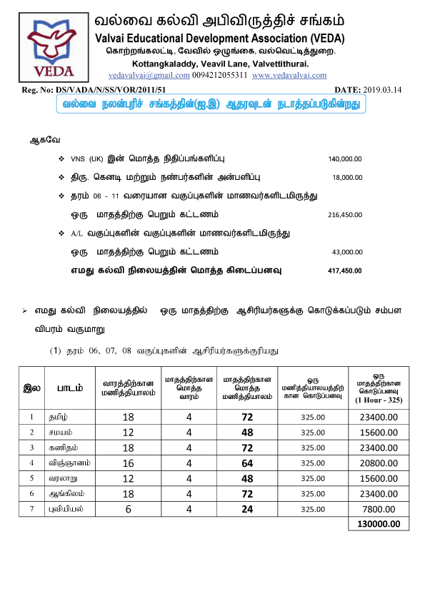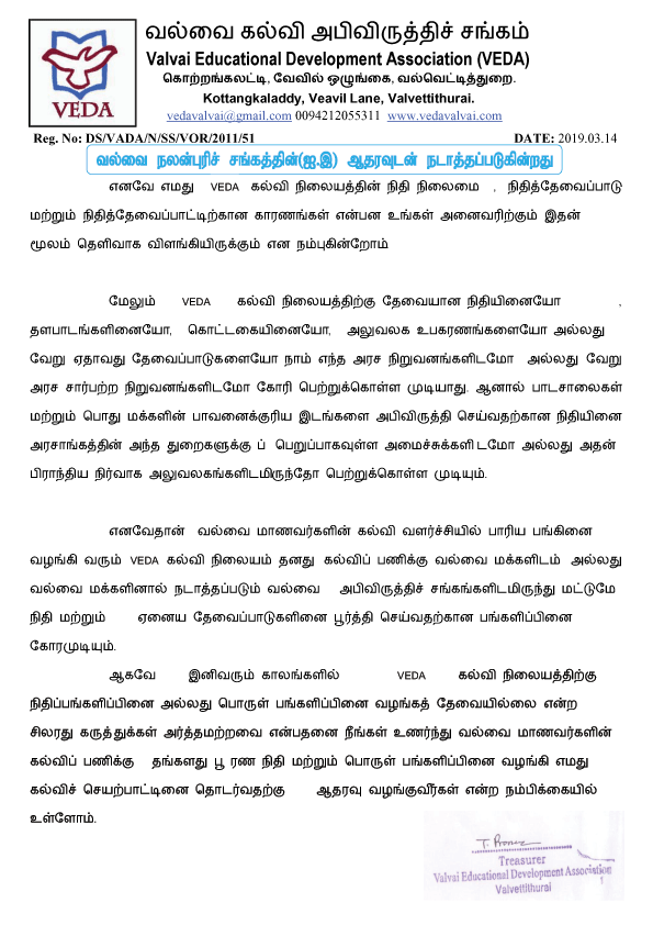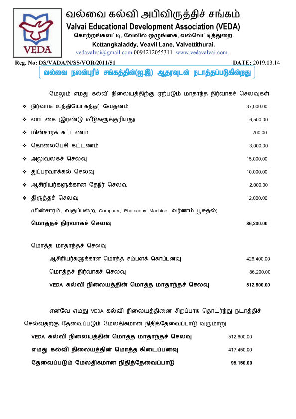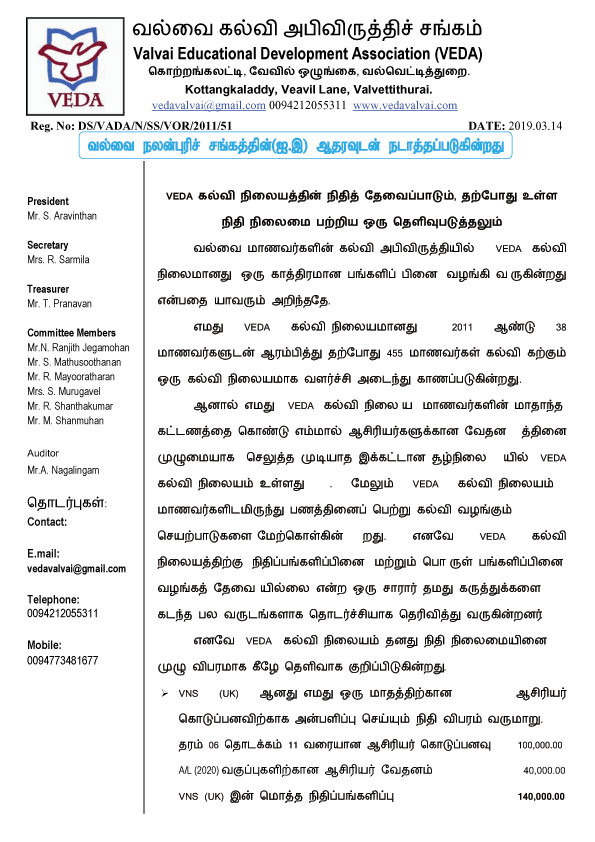 VEDA கல்வி நிலையத்தின் நிதித் தேவைப்பாடும், தற்போதுள்ள நிதி நிலைமை பற்றிய ஒரு தெளிவுபடுத்தலும்.