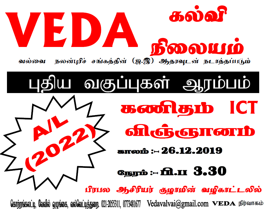எமது VEDA கல்வி நிலையத்தில் 2022 இற்கான உயர்தர கணித, விஞ்ஞான, ICT வகுப்புகள் எதிர்வரும் வியாழக்கிழமை (26.12.2019) அன்று பி. ப 3.30 மணியளவில் ஆரம்பமாக உள்ளது