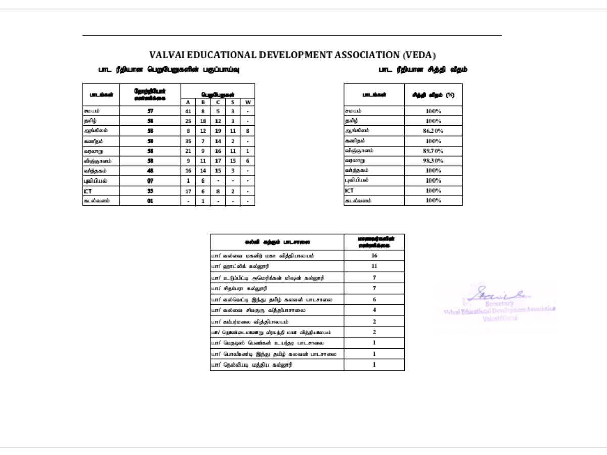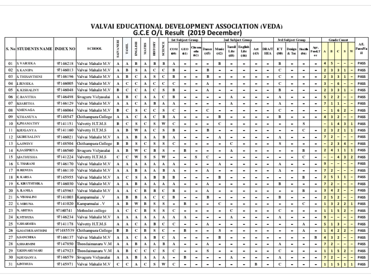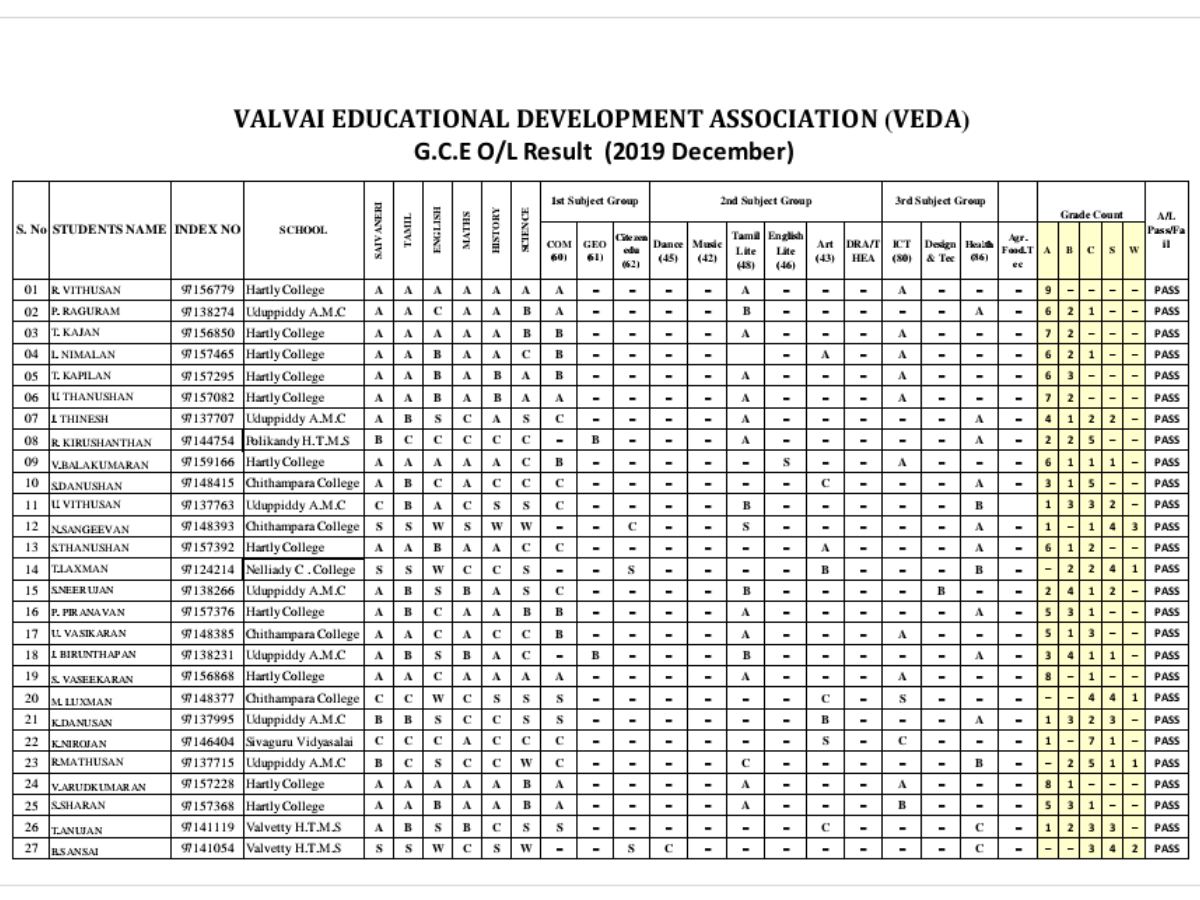 நேற்றைய தினம் வெளியாகியுள்ள கடந்த வருடத்திற்குரிய (2019) க.பொ.த (ச/ த) பரீட்ச்சையில் வல்வைக் கல்வி அபிவிருத்திச் சங்கத்திலிருந்து (VEDA) பரீட்ச்சைக்கு தோற்றிய மாணவர்களின் முடிவுகள்.