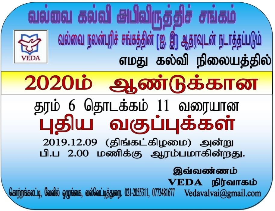 வல்வை நலன்புரிச் சங்கத்தின் (ஜ.இ) ஆதரவுடன் நடாத்தப்படும் VEDA கல்வி நிலையத்தில் 2020 ஆம் ஆண்டிற்கான புதிய வகுப்புகள் (தரம் 06 - 11 வரையான) வரும் 09 ஆம் திகதி திங்கட்கிழமை அன்று மாலை 2.00 மணிக்கு ஆரம்பமாகின்றன.